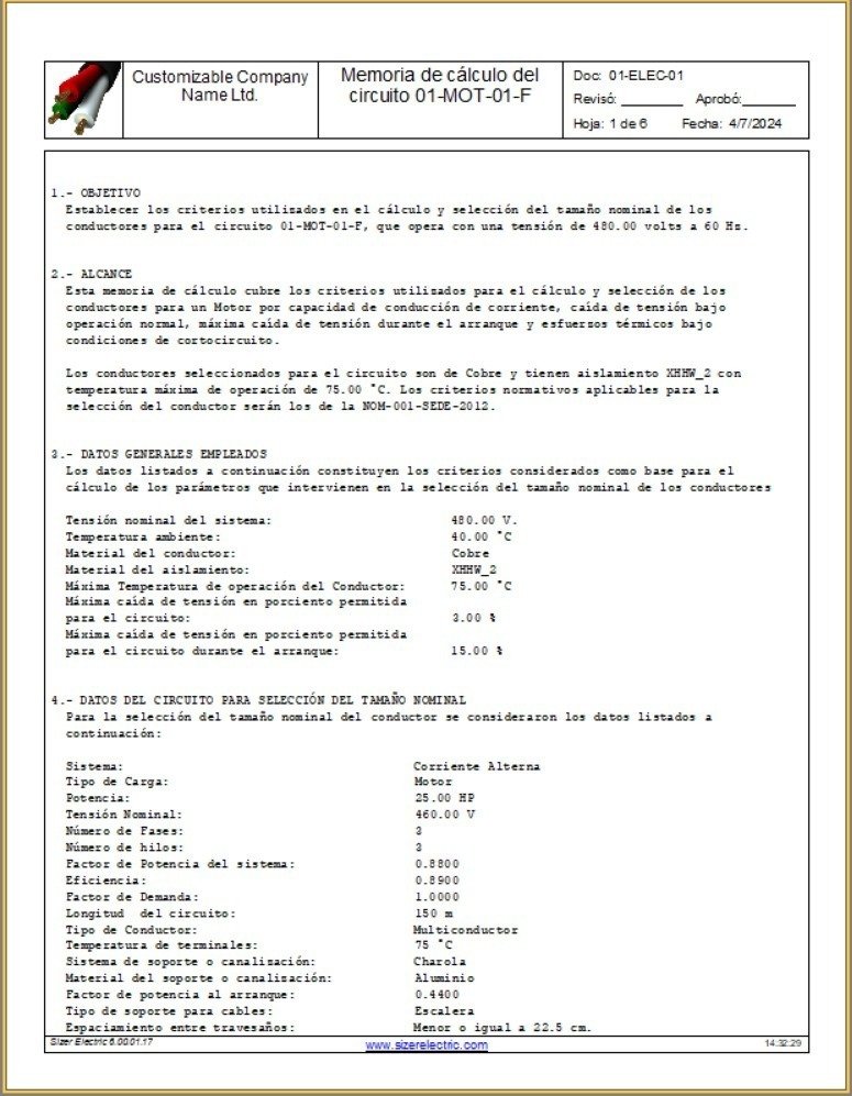 Cada informe generado con LaTeX en Sizer Electric se distingue por su calidad superior y presentación profesional. Esta herramienta asegura que sus documentos técnicos no solo sean precisos, sino también visualmente impactantes, listos para impresionar a sus clientes y colegas.